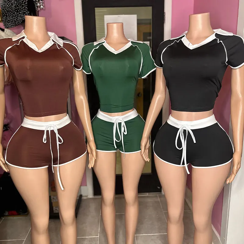 Huili Manufacturer V Neck Stretch Short Sleeve Crop Tee & Hot Shorts 2025 Loungewear Custom logo Two Piece Set Women Sportswear